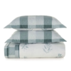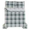Verso com xadrez em tons azuis e frente com estampa de flores e ramos em tons azuis tanto na colcha como no porta travesseiro