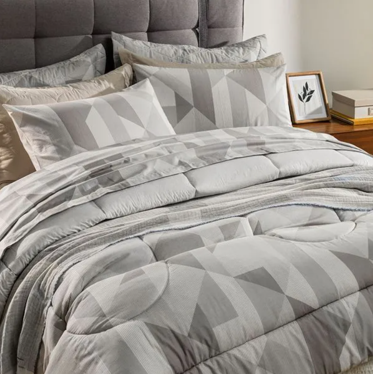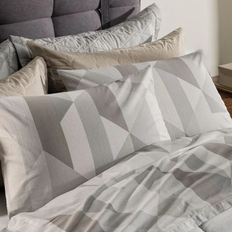 Transforme o seu quarto com o conforto do Jogo de Cama Blasius Queen. Confeccionado em 100% algodão com 160 fios, é a escolha perfeita para quem busca qualidade e bem-estar. Seu tecido encorpado é altamente respirável, com toque hipoalergênico e tecnologia antipilling, garantindo noites tranquilas e durabilidade excepcional. O conjunto é composto por um sobre lençol estampado de 2,40m x 2,40m, um lençol com elástico estampado de 1,58m x 1,98m x 30cm que se ajusta perfeitamente ao colchão e 2 fronhas 50cm x 70cm sem abas, completando o visual sofisticado e moderno. A estampa em tons de cinza e azul adiciona um toque de serenidade e elegância à decoração. Além disso, o jogo Blasius é coordenado com jogos de colcha e edredom da mesma linha.