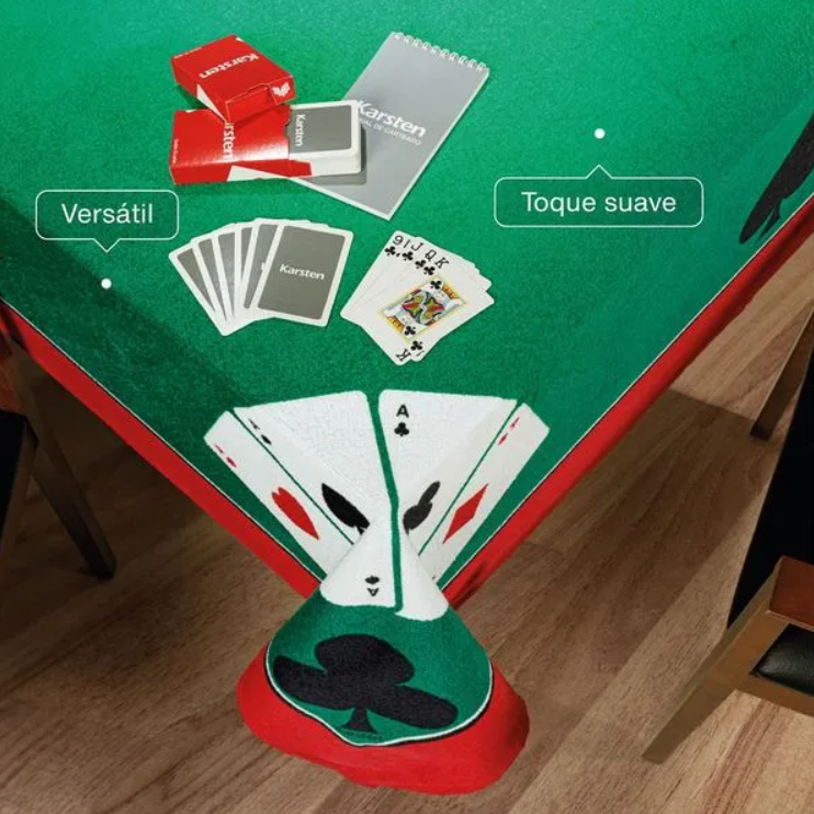 Esta toalha pode ser usada tanto em mesa quadradas quanto redondas de 4 lugares; acompanha bloco de notas e baralho copag personalizado; Enviada dentro de uma caixa decorativa; Toque aveludado.