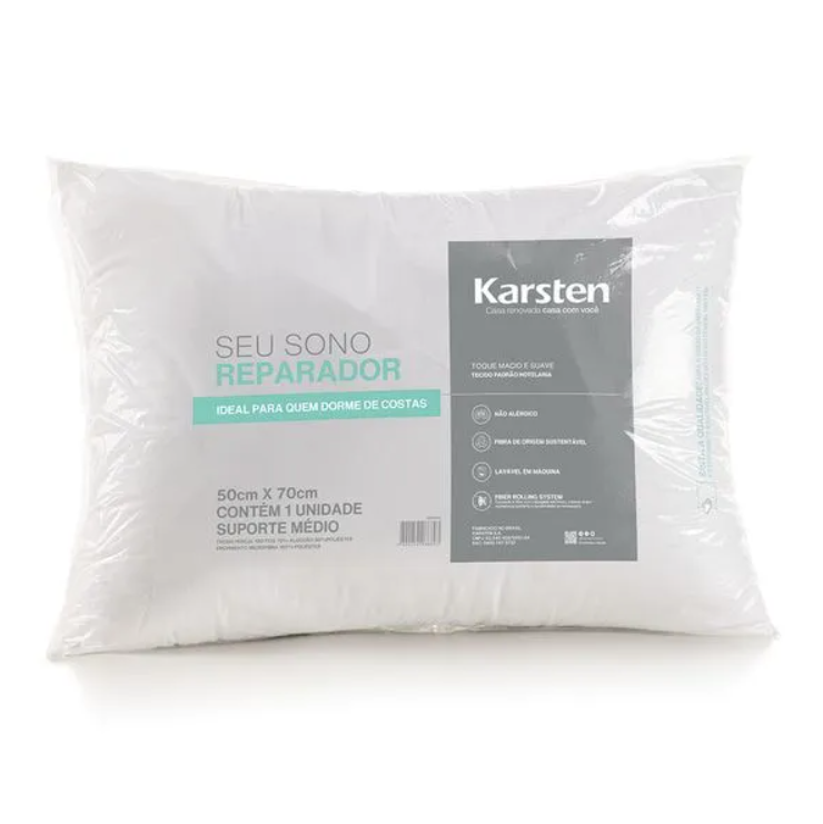 O Travesseiro Sono Reparador Karsten é ideal para quem busca conforto e cuidado ao dormir. Com medidas de 50cm x 70cm e suporte médio, oferece a sustentação perfeita para quem dorme de costas. Produzido com enchimento de fibra siliconada reciclada, é antialérgico e sustentável, cuidando do planeta e da sua saúde. A capa em Percal 180 fios, composta por 70% algodão e 30% poliéster, proporciona um toque suave e respirável. Esse travesseiro é a escolha ideal para noites tranquilas e reparadoras, unindo maciez, frescor e bem-estar em cada detalhe. Para noites de sono reparadoras, a qualidade dos produtos de cama é indispensável, por isso Karsten, vem com opções de cama completa.